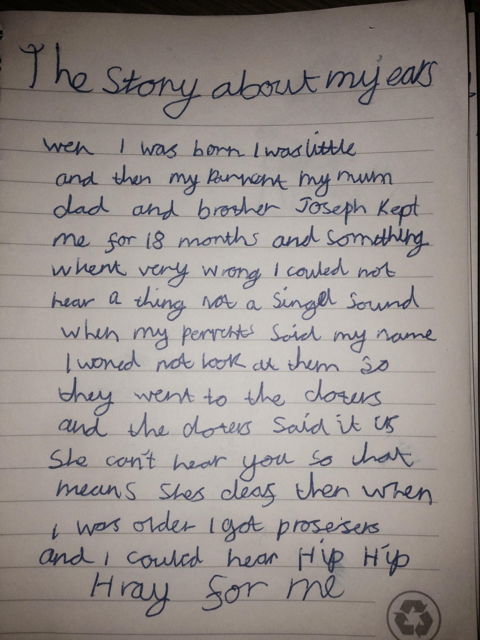 When I was born I was little and then my parents, my mum and dad, and brother Joseph kept me for 18 months and something went very wrong I could not hear a thing not a single sound. When my parents said my name I would not look at them so they went to the Doctor’s and the Doctor said “she can’t hear you” so that means she is deaf. Then when I was older I got processors and I could hear. Hip Hip Hooray for me”
